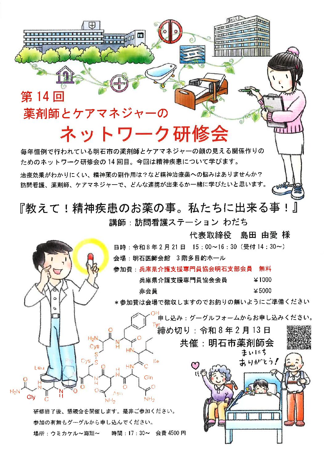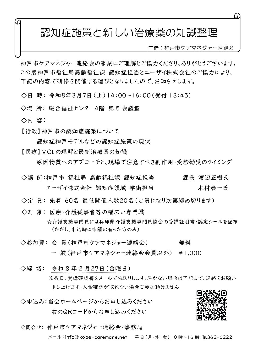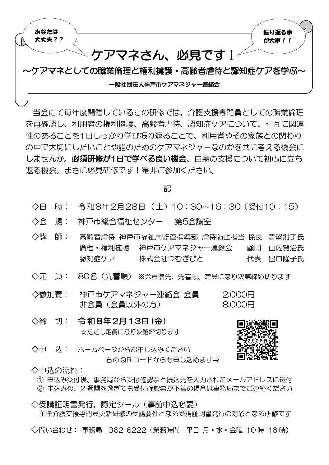 法定外研修 県協会主催 年別アーカイブ 2026年2025年2024年2023年 【D-2】令和7年度 パワーアップセミナー 令和8年1月30日(金) 【D-3】令和7年度 施設ケアマネジャー災害研修 ~HUG社会福祉バージョン訓練~ 令和8年3月19日(木) 受講証明書のPDF出力について(PDF:336KB) 研修受講管理システムFAQ 支部主催 年別アーカイブ 2026年2025年2024年2023年 【B】令和7年度 神戸市 地域同行型研修 ケアマネジメント研修「地域同行型初任者研修」 令和7年12月17日(水)・令和8年1月14日(水)・1月30日(金)・3月4日(水)他 【C-1.5】第14回 薬剤師とケアマネジャーのネットワーク研修会 明石市 令和8年2月21日(土) 【A・B・C】ケアマネさん、必見です!~ケアマネとしての職業倫理と権利擁護・高齢者虐待と認知症ケアを学ぶ~ 神戸市 令和8年2月28日(土) 【C-2.0】認知症施策と新しい治療薬の知識整理 神戸市 令和8年3月7日(土) 他団体の研修情報 年別アーカイブ 2026年2025年2024年2023年 【B-3.0】職業倫理~専門職として期待される行動とは~ 神戸市令和8年2月3日(火) 【C-2.5】医療・介護従事者向け人生会議(ACP)実践報告会(多職種連携編) 神戸市令和8年2月5日(木) 【A-2.0】令和7年度第2回成年後見セミナー『現場で活かす成年後見』 高砂市令和8年2月12日(木) 【B-3.0】介護現場における多職種連携とコミュニケーション技法 神戸市令和8年2月16日(月)