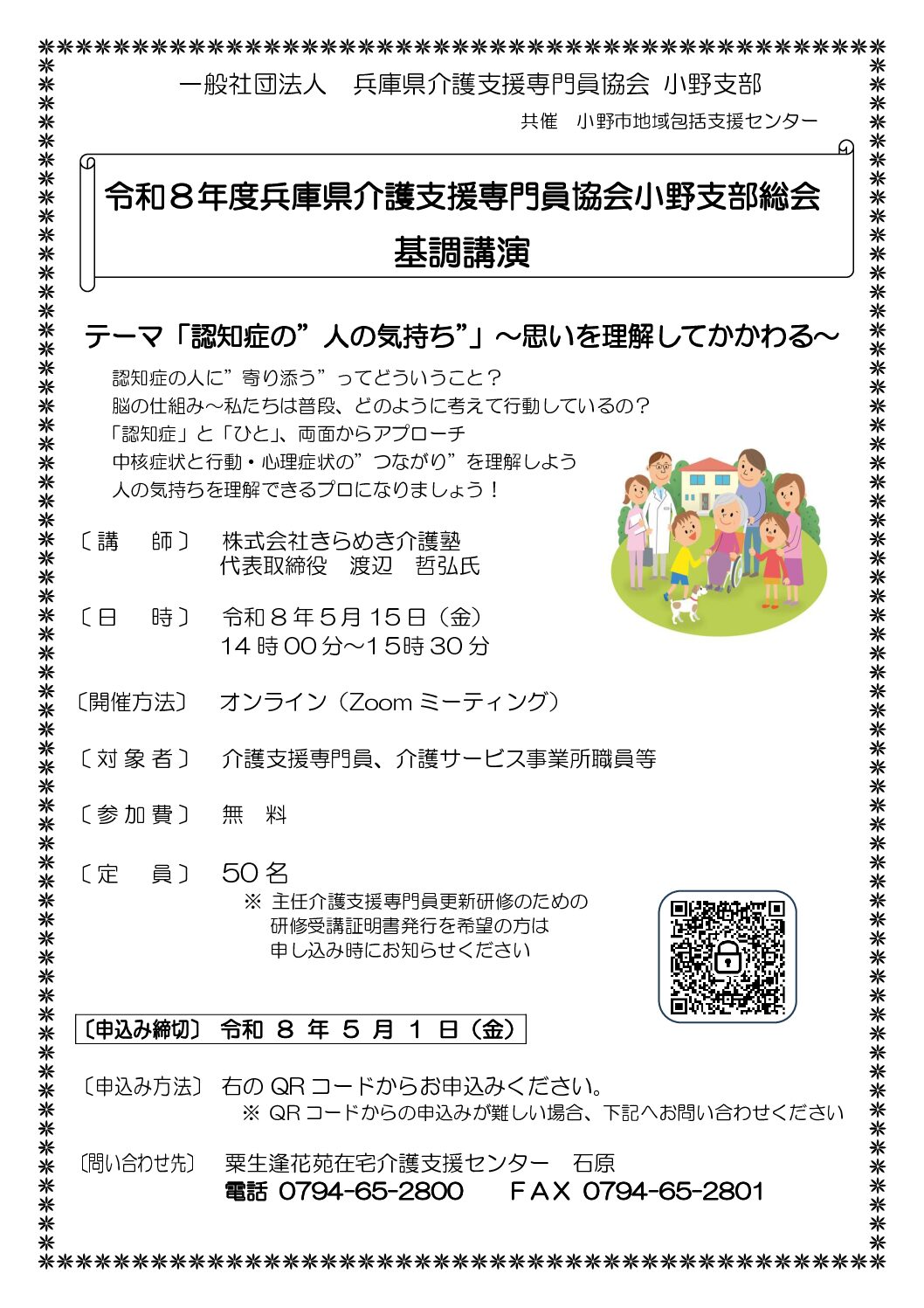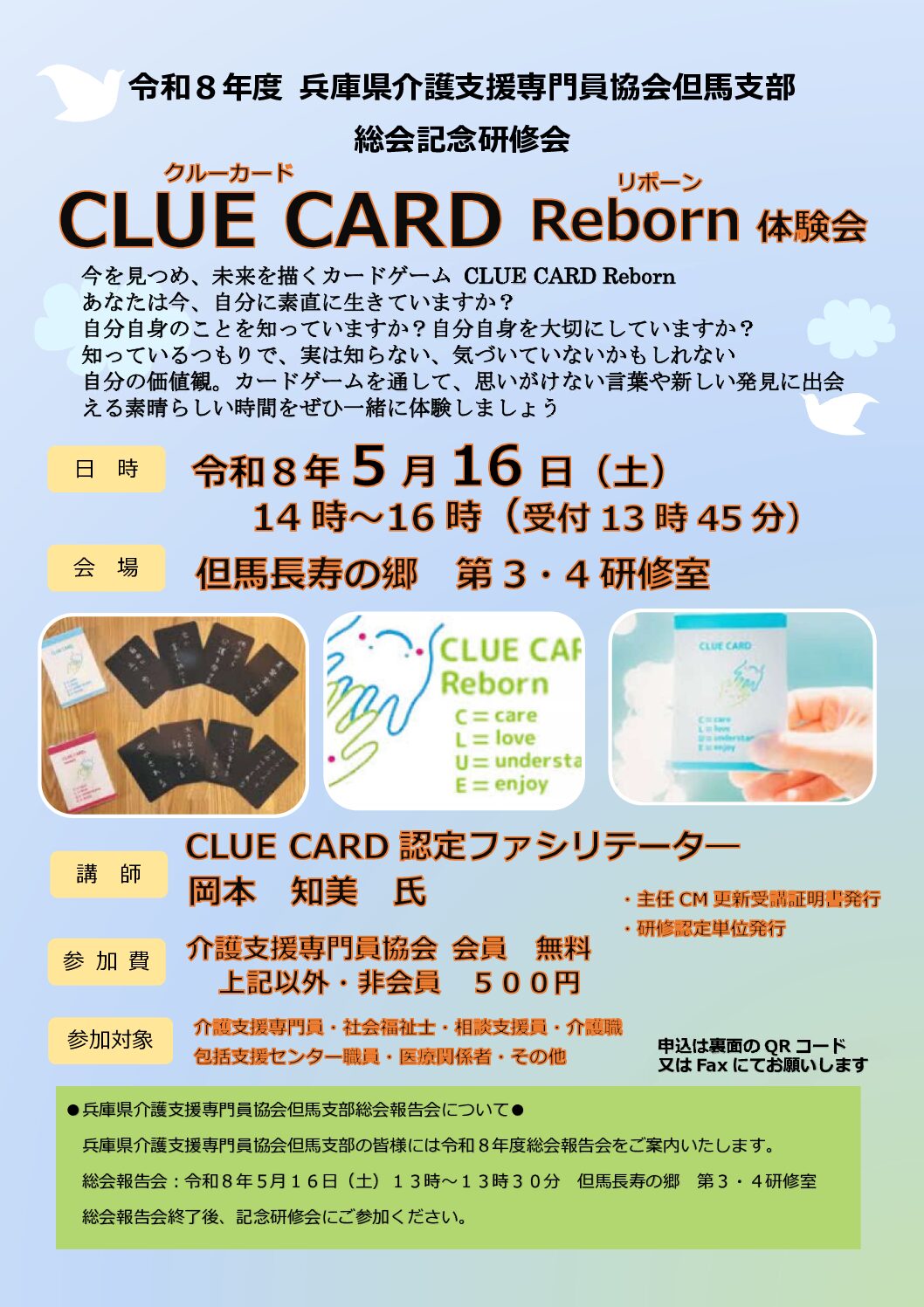 法定外研修 県協会主催 年別アーカイブ 2026年2025年2024年2023年 【D-2】令和8年度 倫理研修3部作【倫理・ハラスメント・コンプライアンス】第2弾 令和8年5月15日(金) 【D-2】令和8年度 倫理研修3部作【倫理・ハラスメント・コンプライアンス】第3弾 令和8年6月23日(火) 受講証明書のPDF出力について(PDF:336KB) 研修受講管理システムFAQ 支部主催 年別アーカイブ 2026年2025年2024年2023年 【B-2.5】「私」をすり減らさない支援のカタチ 加東市 令和8年4月23日(木) 【C-1.5】「認知症の”人の気持ち”」~思いを理解してかかわる~ Zoom 令和8年5月15日(金) 【B-2.0】R8年度 但馬支部総会記念研修会 CLUE CARD Reborn 体験会 養父市 令和8年5月16日(土) 他団体の研修情報 年別アーカイブ 2026年2025年2024年2023年 【B-4.5】令和8年度福祉専門職対象防災対応力向上研修 e-Learning令和8年4月1日(水)~9月30日(水) 【B-6.0】2026年度地域包括支援センター初任者研修 Zoom令和8年6月10日(水)